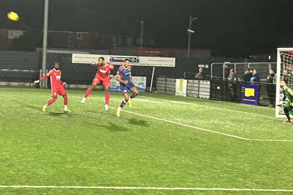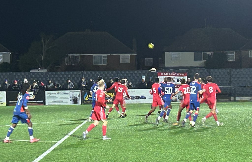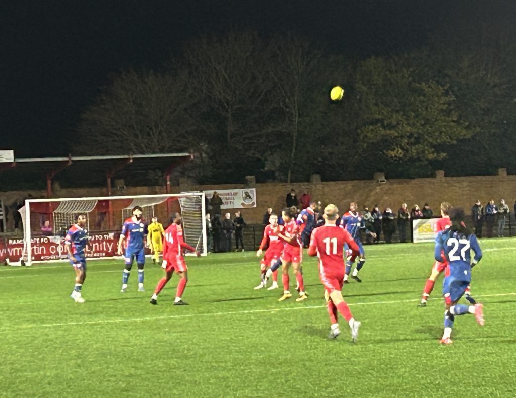 It wasn’t all one way, however the visitors didn’t threaten the Ramsgate goal until TQ Addy’s header was knocked out by Ramsgate goalkeeper Aiden Prall and Manu Oke-Williams’ follow up was blocked on the line.