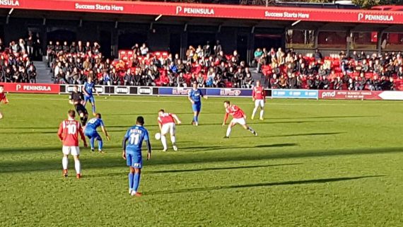 Salford didn’t have it all their own way as Fleet worked ever so hard to limit them to shots from outside the box and utilise Corey Whitely’s speed on the break.It was clear from the off that Salford were going to play neat, flowing football and in Scott Wiseman and Tom Walker down the right, they had an effective attacking flank. From that route came City’s first attack on three minutes but Nathan Ashmore was nearest to the cross.