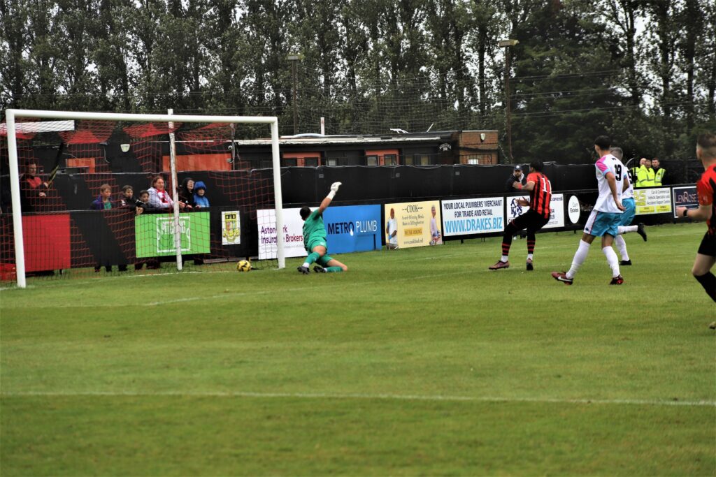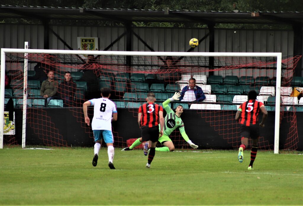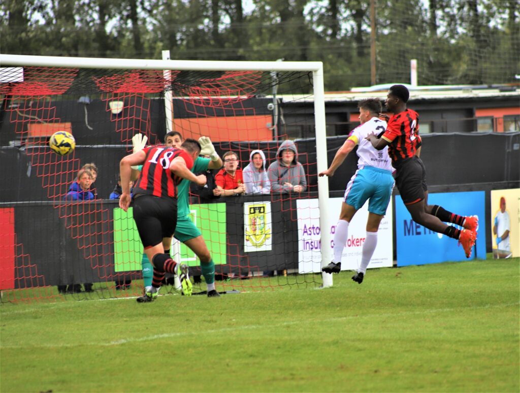 Early on Sittingbourne had the better of things with long balls into the Bulls box not being dealt with in a swirling wind that caused problems all afternoon. The home side indeed thought they’d taken the lead on seven minutes when Darnell Kithambo sent a brilliant low drive past Euan van der Vliet into the corner of the Jersey net. Celebrations though were cut short by the latest of late flags.