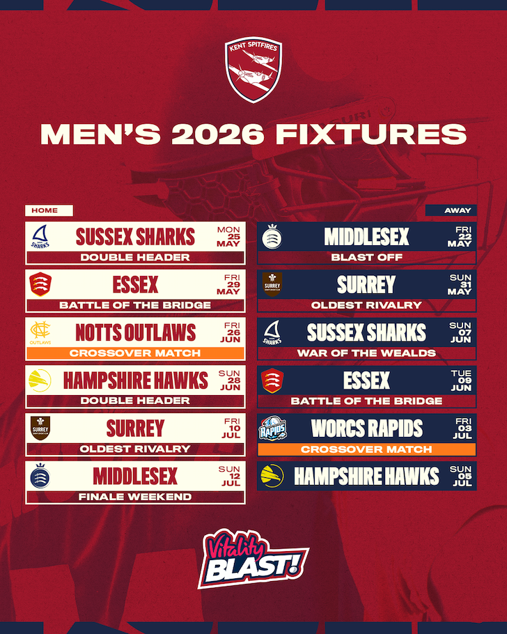 Kent will face Sussex Sharks’ Men’s & Women’s sides in Canterbury on Bank Holiday Monday, 25th May, with all 2026 Men’s & Women’s Vitality Blast fixtures now revealed for this upcoming Summer.
