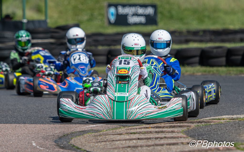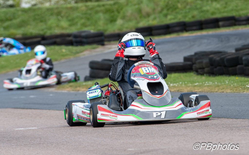 Pickett tucked in behind at the wheel of his Project One kart as the pair fought a close race long duel, with Lilly just coming out on top of an enthralling race, winning by 0.18s at the end. Singh’s yellow and black kart held third before Burton overtook him with 3 laps to go to take third, punching the air in celebration as he did so. Behind Singh in 4th – Alfie Bi came out on top of a four-kart close fight to take 5th from Moreton, Hulbert and Spooner-Green in 6th, 7th & 8th. Honey took 9th and Oliver Jones 10th, with the fastest lap going to the winner Lilly on lap 11, with a time of 52.55s.