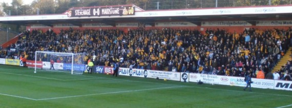 The near 1,400 Maidstone fans in the South Stand were signing “Stand up if you love the Stones” with 10 minutes left, and as if inspired, Collin turned smartly past Wells and drove powerfully into the Stevenage area. With Day to beat, Collin’s shot was deflected away of the keeper’s legs.