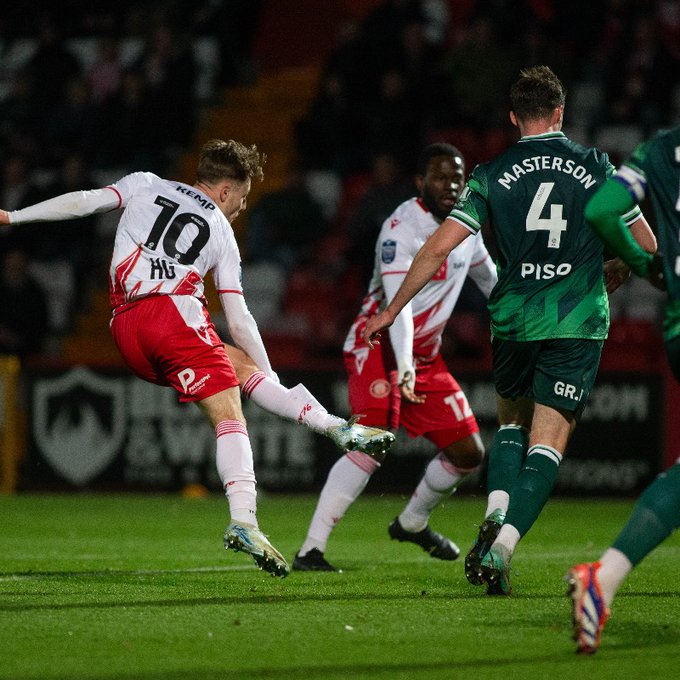 Needing to win by two clear goals to move into the knock-out stages, Mark Bonner’s side took a first half lead when Josh Andrews drilled home from Jayden Clarke’s pass, but when Dan Kemp levelled in the second half, the match itself finished level and the hosts went through to the next round.