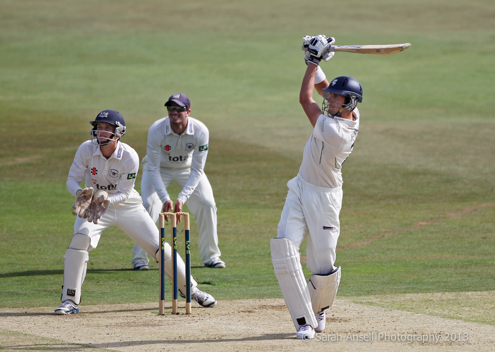 Ben Harmison of Kent bats as wicket keeper Gareth Broderick and Michael Klinger of Gloucestershire look on during Day 1 of Kent v Gloucestershire LVCC Division Two at The Spitfire Ground, St Lawrence, Canterbury, England on 21 August 2013. Photo: Sarah Ansell.
