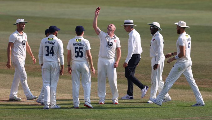 Jordan Cox and Jack Leaning put on an unbeaten 423 for the second wicket for the Spitfires, an all-time club record partnership, helping Kent to 530-1 after their 120 overs before Stevens took his 27th first class five-wicket haul to help bowl Sussex out for 173, 25 short of making Kent bat again.