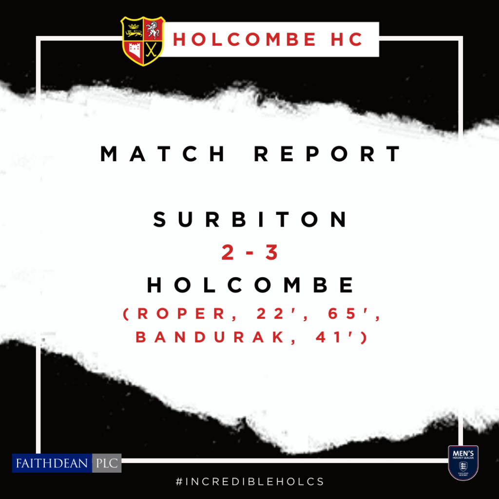 Holcombe moved back to the summit of the Premier Division table following their 3-2 win over Surbiton at Sugden Road courtesy of goals from Phil Roper (2) and Nick Bandurak.