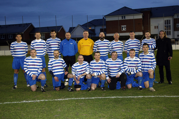 Kent Veterans Cup Final. Hotel de Ville v Tankerton FC. Hotel de Ville in blue and white stripes.
