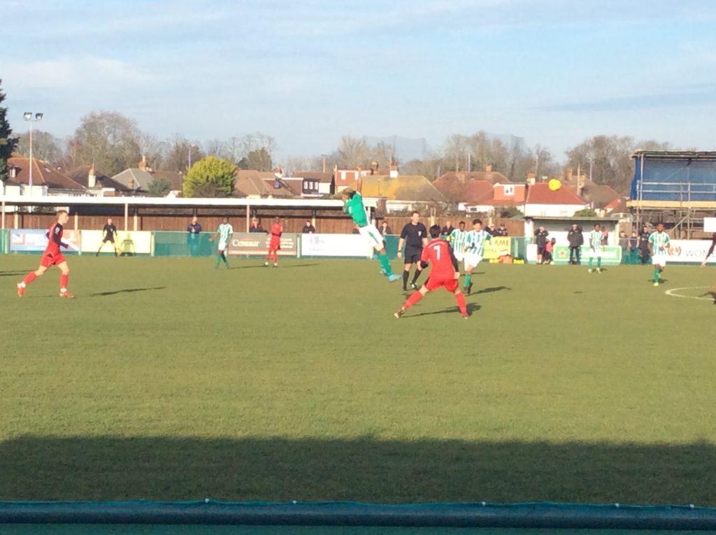 Both teams had chances from corners early on. Hopkins volleyed wide from an Ashley Probets delivery then Jack Steventon hit the post with an instinctive volley from Kelvin Ogboe’s low corner at the other end.
