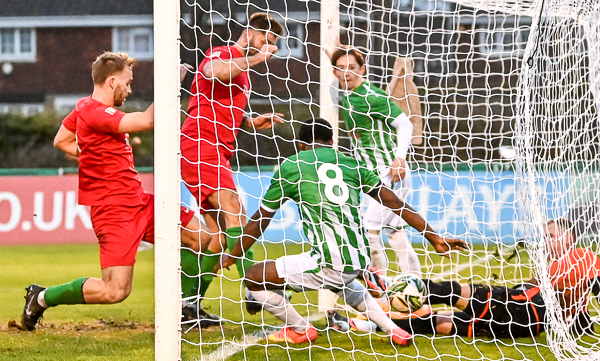 Seven minutes before half time, the visitors stunned VCD by increasing their lead. A Vickers’ header fell to Ben Catt twenty-five yards out and his sweetly struck volley flew into the top corner.