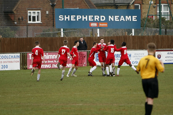 Kent Under 16 Youth Cup Final. Maidstone United v Welling United. Welling in red.