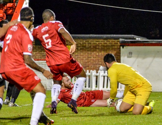 How it wasn’t one all less than a minute later is still a mystery. Another Hayes cross found Ben Francis all alone in the middle but with the goal at his mercy he headed softly straight at Harry Girling in the Welling goal.