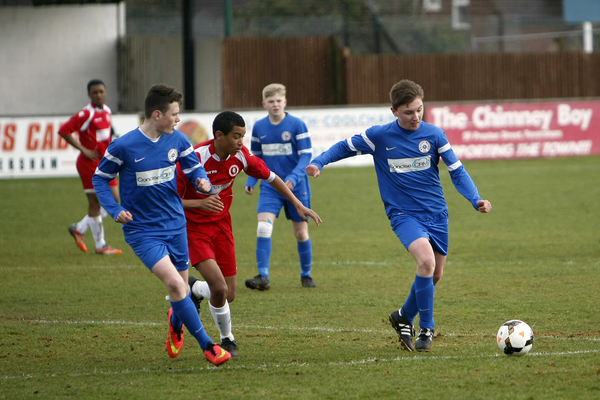 Kent Under 15 Youth Cup Final. Bridon Ropes v Welling United. Welling in red.