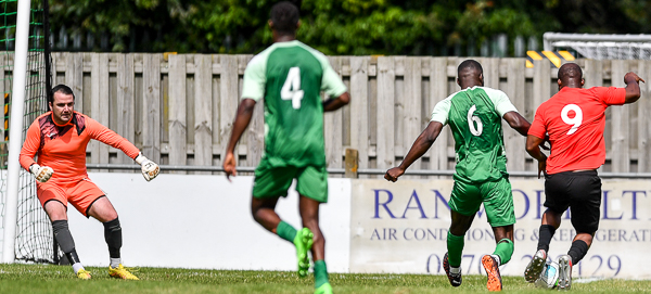 Rankin’s quick accurate kick picked out Vinnie Medhurst and he played it behind the Cobham defence for Kasai to chase. He sized up his shot but blasted it just too high and it crashed against the bar and over.