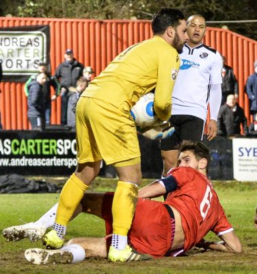 Alex Cathline then came on as substitute and twice had opportunities to mark his Welling debut with a goal. First he fired wide after Harry Crawford’s shot was blocked then Ibrahim saved from his low shot at the second attempt.