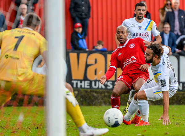 Then came the big moment when Cook went on a long run and as he burst into the box he was clipped and fell. The referee, who was in a good position turned down Welling’s penalty appeals but didn’t caution the flying winger either.