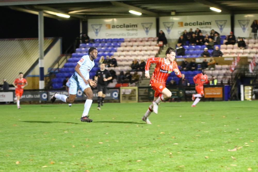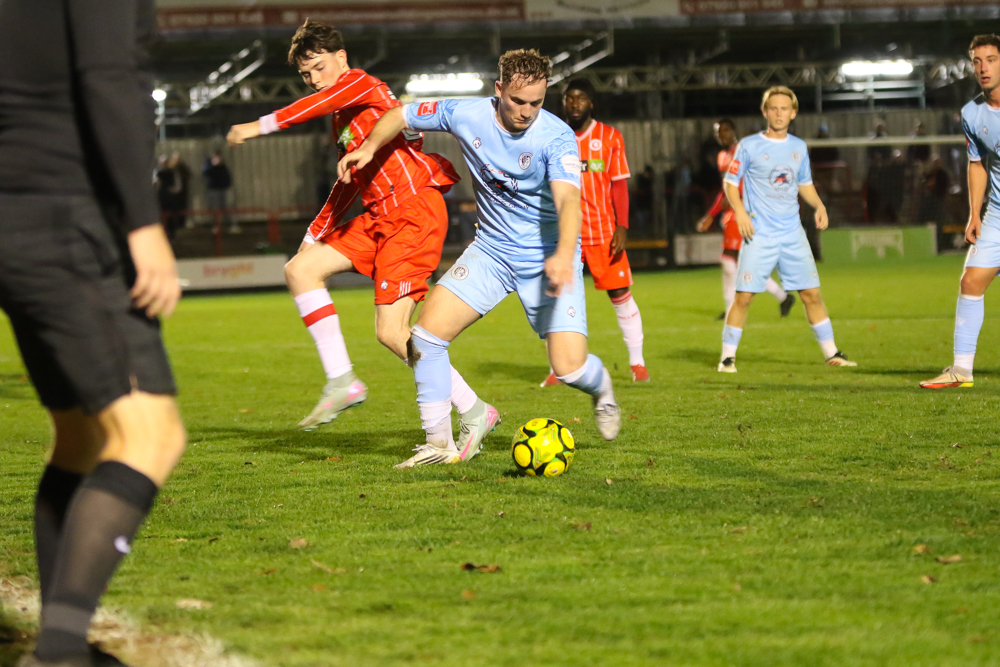 As the first half came to a close, Folkestone missed two great opportunities to increase their lead. First Rance volleyed Joel Odeniran’s cross over from point blank range then Pigott went on a long run before his diagonal pass picked out Hutchinson unmarked, and he fired wide of the near post when he should probably have done better.