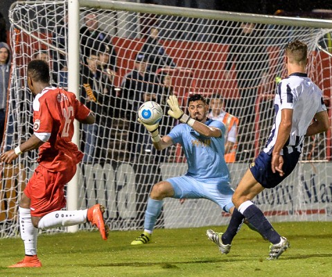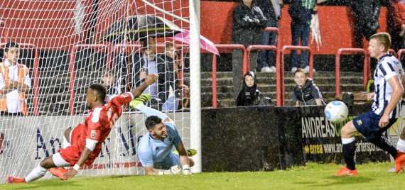 Alfie Pavey got clear of the offside trap but it didn’t sit up for him and Lewington did well to come out and block.