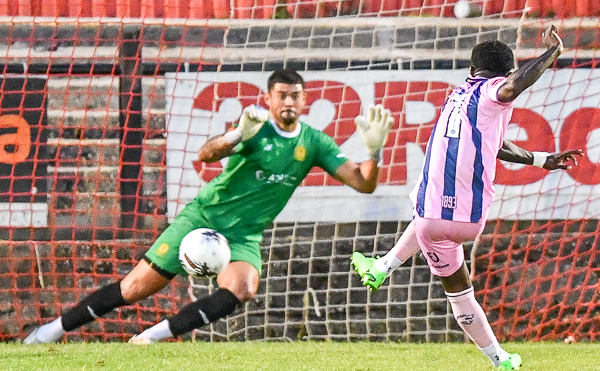 James Vaughan struck it sweetly but the Dulwich trialist goalkeeper read it and made an excellent save.
