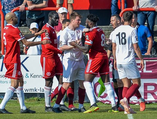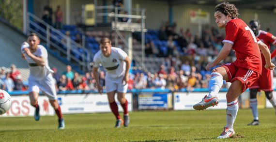 Brendan Kiernan then got in behind and as he prepared to slot home, Chez Isaac brought him down from behind. Isaac was dismissed and Goldberg ignored all distractions to slam home the penalty.