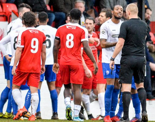 Christian Nanetti fired over before Ricky Gabriel’s moment of madness made it that much tougher for the visitors. He seemed upset about a challenge by Callum Driver and grabbed him by the scruff of the neck. After a minor kerfuffle, he again grabbed Driver and gave the referee no option but to dismiss him.