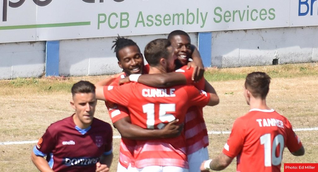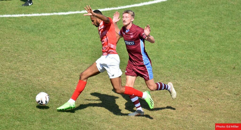 With the mercury heading past 30°, a slow start might have been forgiven yet it was anything but. Weymouth won a corner in the first minute that Tom Blair ended up thudding into Mark Cousins’ hands but with the very next attack Fleet were ahead. It came in innocuous enough circumstances, Rakish Bingham finding Poleon with a great ball splitting the Weymouth back line. Poleon turned smartly and hit a shot that might not ordinarily have been expected to trouble goalkeeper Bert Smith but he didn’t get enough on it and it rolled over the line and in.