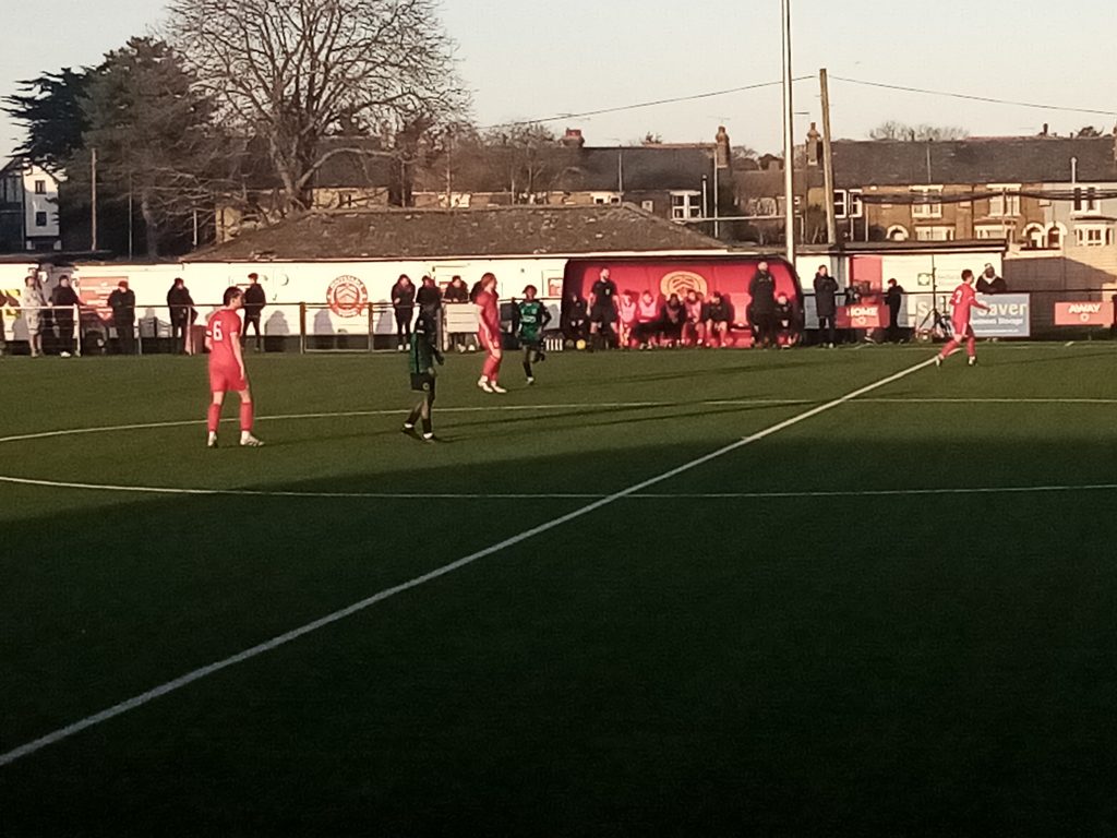 After a tight first half Will Efambe finished off a brilliant move to drill the ball beyond Dan Colmer in the home goal before a hugely controversial sixty seconds turned the game in the home sides favour. Khayrie Harris was felled on the edge of the home box and referee Mottram looked like he was about to give the foul before the shot fizzed over Colmer’s bar.