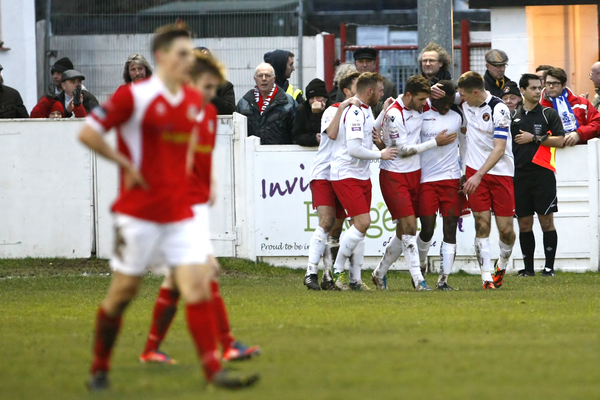 FA Trophy match Whitstable v Ebbsfleet. Ebbsfleet celebrate their first goal.